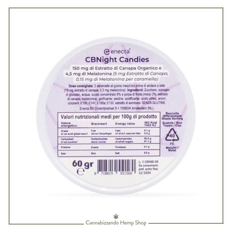 Le caramelle per dormire CBNight, con estratto di canapa e melatonina sono pensate per sostenere il tuo ritmo circadiano, in caso di disturbi del sonno, risvegli notturni o difficoltà ad addormentarti. Agiscono in modo naturale ma efficace, favorendo un sonno continuo e riposante. La melatonina contribuisce a regolare il ciclo sonno-veglia, aiutando l’organismo a riconoscere il momento giusto per rilassarsi e addormentarsi. L’estratto di canapa favorisce uno stato di calma e quiete, utile per allentare le tensioni della giornata. Insieme, sostengono un sonno più naturale, continuo e rigenerante.