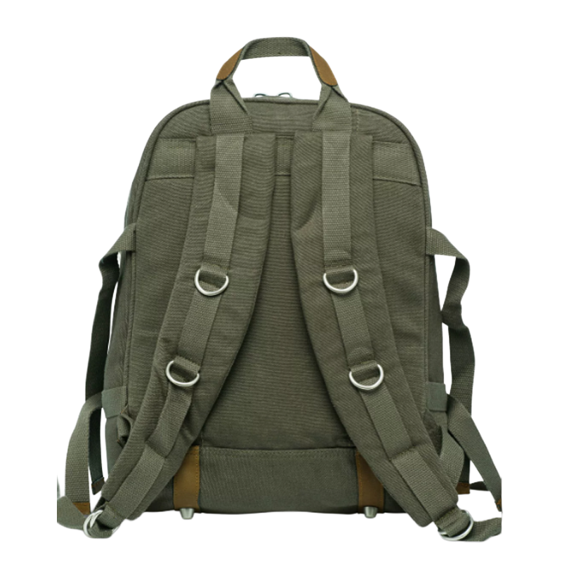 Zaino capiente in canapa e cotone biologico con cerniera avvolgente. Schienale imbottito e spallacci imbottiti e regolabili con anelli a D. Spallacci e fondo dello zaino rinforzati con strisce di pelle e piedini in metallo.