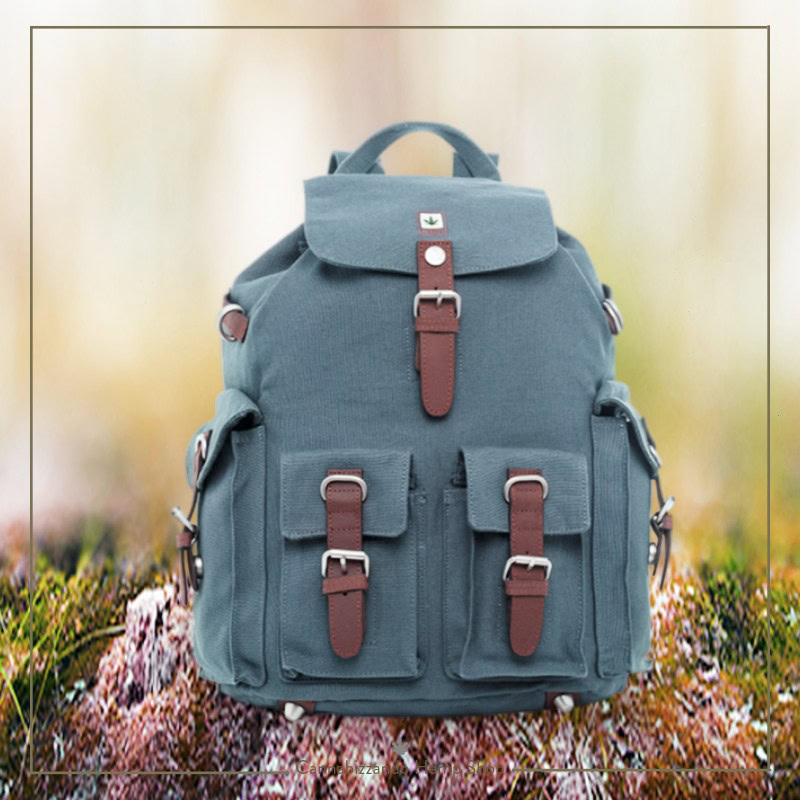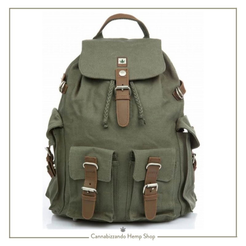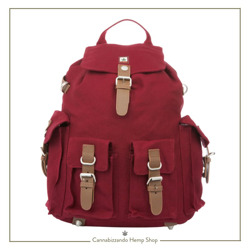Lo scomparto principale, che è chiuso con un cordoncino, è posizionato sotto una patta che ha una chiusura magnetica. All’interno dello scomparto principale è presente uno scomparto con zip. Questo zaino in canapa e cotone organico ha due tasche frontali, insieme a tasche laterali più grandi montate sia sul lato destro che sul lato sinistro; i lembi per le tasche sono fissati in posizione da una chiusura magnetica. La base è rinforzata con strisce di cuoio e piedini di metallo. Gli spallacci sono regolabili in lunghezza. C’è un ulteriore scomparto con zip situato sotto gli spallacci posteriori.